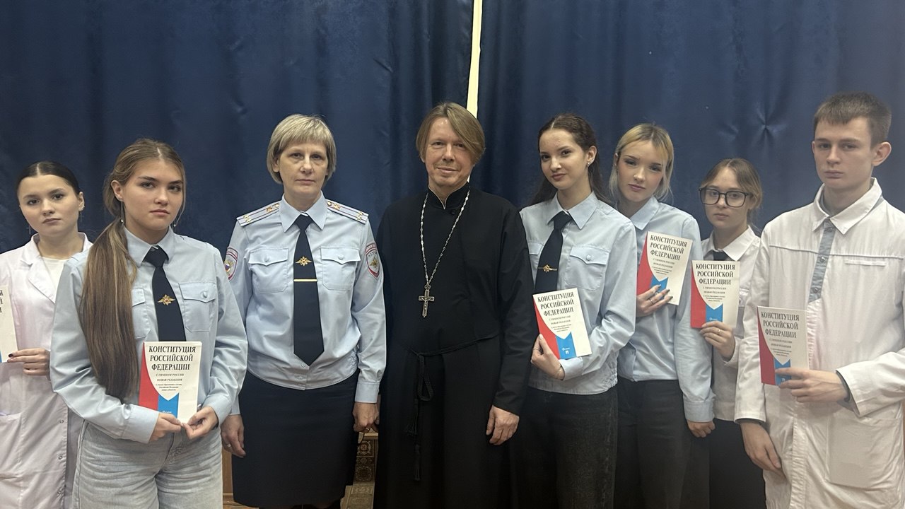 — Я считаю, патриотизм важным звеном в процессе становления Вас, юных сызранцев, как личности, – обратился он к студентам. – Это понятие неразрывно связано с родными корнями, культурой, традициями предков, героическим прошлым нашей Родины и конечно, с основами нашего конституционного строя, закрепленными в основном документе страны. Поэтому в этот праздничный день, мы хотим вручить всем присутствующим экземпляр Конституции Российской Федерации. Уверен, что он обязательно пригодится, особенно ребятам, обучающимся по специальности «правоведение» – резюмировал отец Александр.