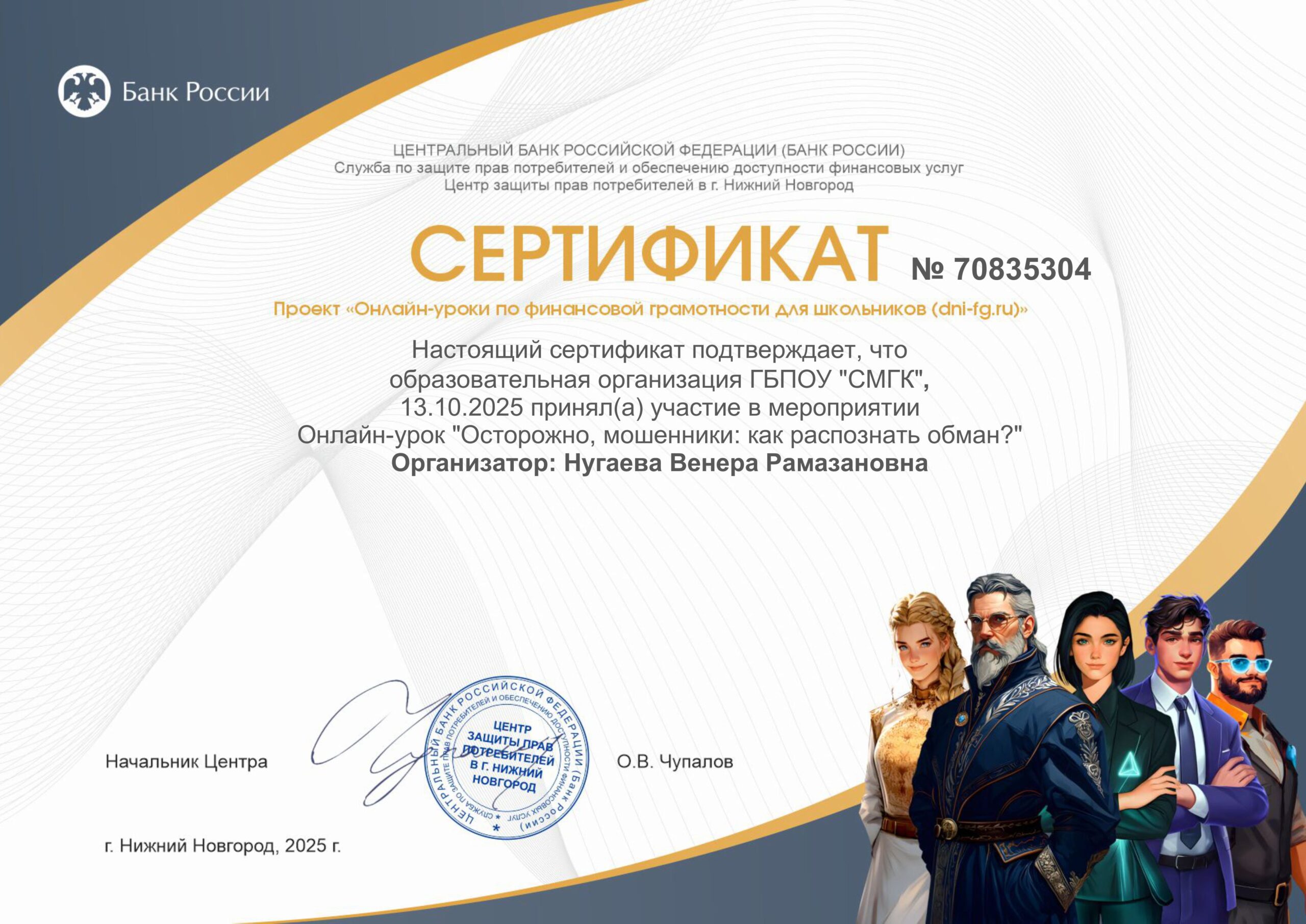 В целях формирования финансовой грамотности обучающихся в октябре 2025 года в учебных группах 141, 171, 181, 119, 120 (113 человек) преподавателем Нугаевой Венерой Рамазановной проведены уроки по актуальным темам «Осторожно, мошенники: как распознать обман?», «С деньгами на «ты» или Секреты финансовой грамотности», «Инфляция: почему цены растут и на что это влияет?», «Цифровой рубль: мифы и реальность», «Пять правил: как грамотно занимать и одалживать деньги».