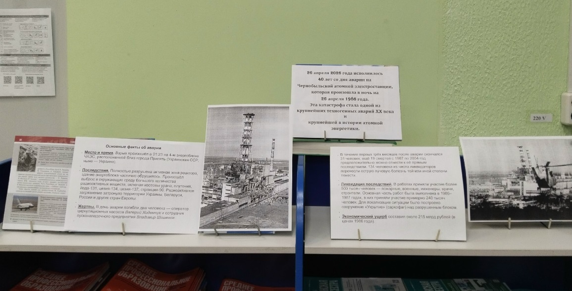 В библиотеке колледжа организована выставка «Чернобыльская катастрофа». На полках представлены статьи и документальные материалы, посвящённые причинам аварии, её последствиям и урокам для будущих поколений.