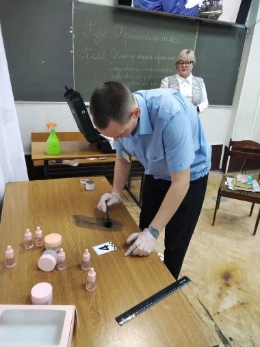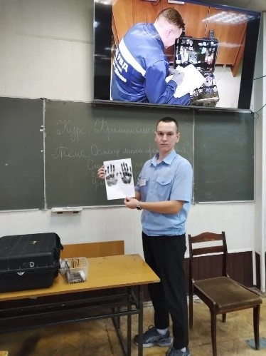 В ходе урока обучающиеся разыграли работу дежурной части, деятельность следственно-оперативной группы в составе следователя, криминалиста, оперуполномоченного ОУР, участкового уполномоченного полиции ОУУП и ПДН, кинолога с использованием криминалистической техники (содержимого криминалистического чемодана). В ходе инсценированного расследования участниками игры были получены свидетельские показания и составлен словесный портрет преступника; произведён осмотр места происшествия, обнаружены, зафиксированы и изъяты следы преступления, а именно: следы пальцев рук, след обуви, запаховый след; составлена дактилоскопическая карта потерпевшей гражданки.