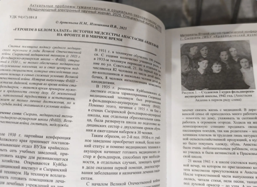По материалам Второй научно-практической конференции «Гурьевские краеведческие чтения» 2025 года, был издан сборник работ, в который вошла работа Артемьевой Н.М., и Илюшкиной П .(гр.281) «Героизм в белом халате: история медсестры Анастасии Авдеевой на фронте и в мирное время». Сегодня книга была торжественно вручена авторам работ.