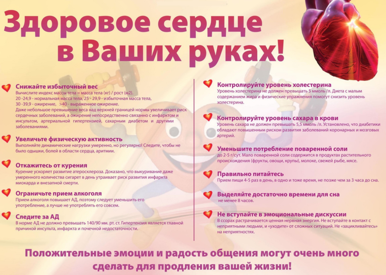 Чтобы поддерживать и сохранять здоровье сердечно-сосудистой системы необходимо вести здоровый образ жизни, отказаться от вредных привычек, сохранять умеренную физическую активность в объеме не менее 150 мин в неделю, поддерживать оптимальную массу тела, придерживаться рационального питания, а также контролировать артериальное давление, сердечный ритм, уровень холестерина и глюкозы крови;