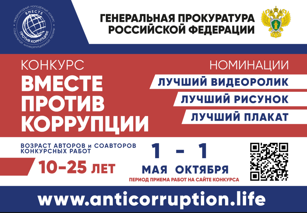 Генеральной прокуратурой Российской Федерации в 2026 году организовано проведение Международного молодежного конкурса социальной антикоррупционной рекламы «Вместе против коррупции!» (далее — конкурс), участниками которого является молодежь из всех государств мира.