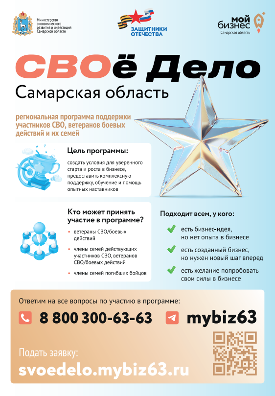 Региональная программа «СВОе Дело. Самарская область» реализуется областным минэкономразвития и центром «Мой бизнес» при поддержке Правительства Самарской области и фонда «Защитники Отечества» в рамках национального проекта «Эффективная и конкурентная экономика».