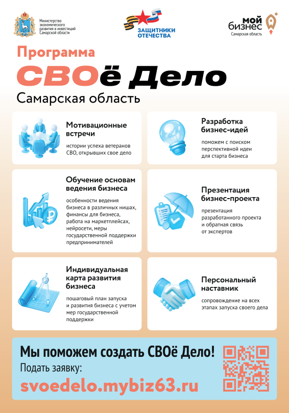 Региональная программа «СВОе Дело. Самарская область» реализуется областным минэкономразвития и центром «Мой бизнес» при поддержке Правительства Самарской области и фонда «Защитники Отечества» в рамках национального проекта «Эффективная и конкурентная экономика».