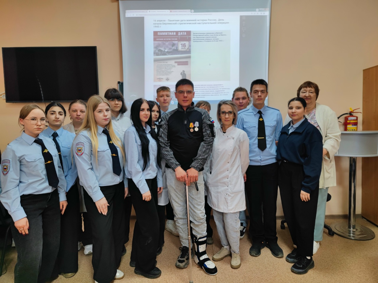 16 апреля в колледже прошла встреча с участником специальной военной операции Тумановым Максимом Сергеевичем, приуроченная к годовщине начала Берлинской наступательной операции 1945 года. Это мероприятие стало важным событием, так как позволило не только вспомнить исторические события, но и обсудить современные реалии.